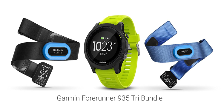 There are two Garmin Forerunner 935 bundle options to choose from. You have the option to buy just the running watch ($500) or the tri bundle which is the watch, heart rate strap, and heart rate swim strap ($650).